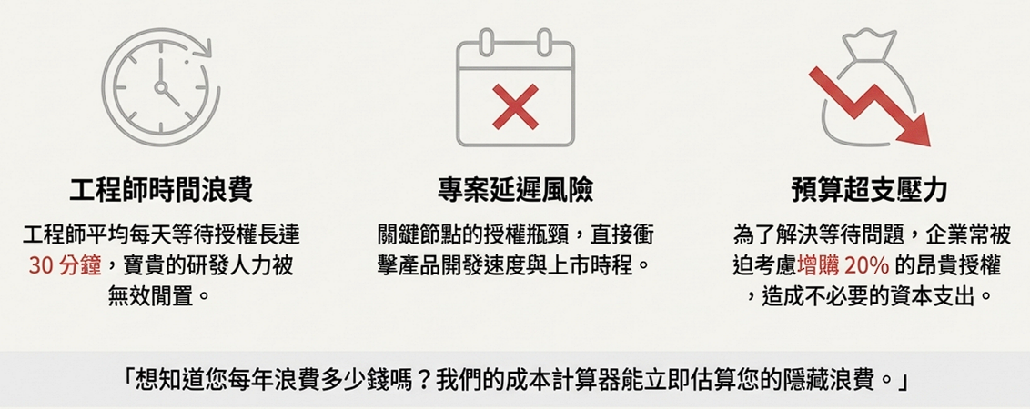 2025-12-08 OptiLIC 閒置授權智慧回收,加速研發軟體使用效率 文件下載 & 影音介紹 昂貴的CAD授權,為何總在關鍵時刻「授權不足」? 您的研發團隊是否也厭倦了排隊等待? 這不僅是日常的困擾, 更是侵蝕效率的開始。 傳統軟體管理方式, 已無法應對今日的研發節奏。 OptiLIC: 從「被動管理」到「主動優化」的智慧授權引擎, 獨家「閒置授權自動回收」技術,安全且高效. 轉型實證: 台灣知名電子大廠如何節省500萬年度預算? 導入30天,成效立竿見影. OptiLIC最新消息 & 議題分享連結